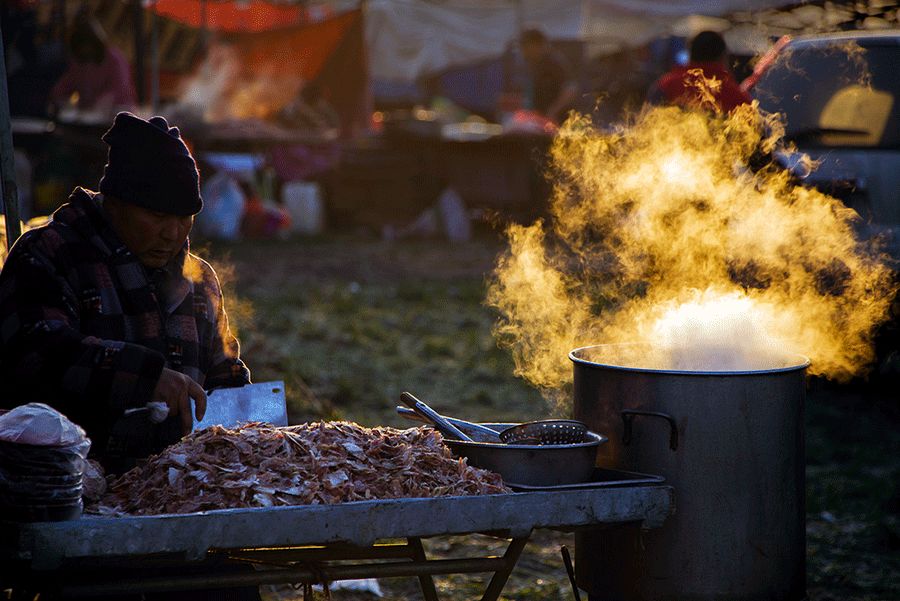 臘八節(jié),午夜剛過(guò),他就和家人搬出擦得锃亮的銅鍋,把預(yù)先泡過(guò)的五谷雜糧如小米、紅豆、紅棗、桂圓等開(kāi)始熬煮,待到臘八早晨每人一大碗,唏哩呼嚕地喝個(gè)盡興;